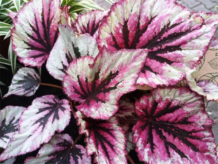 Die Begonie 'Evening Glow'® (Begonia rex) ist eine Pflanze mit durch die dunkelroten Blattadern dekorativen, cremeweißen Blättern. Sie sind herzförmig und gewellt. Bevorzugt wird ein halbschattiger Standort.