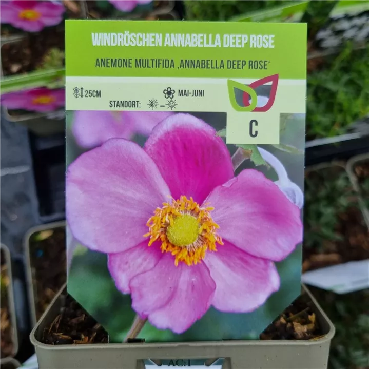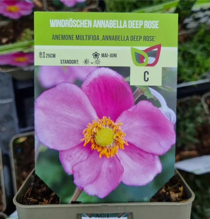 Das Frühsommer-Garten-Windröschen 'Annabelle Deep Rose' (Anemone multifida) bringt ansehnliche, dunkelrosafarbene Blüten von Mai bis Juni hervor. Bevorzugt wird ein durchlässiger, humoser Boden in sonniger Lage. Die rhizombildende, buschige Staude erreicht gewöhnlich eine Höhe von 25 - 30 cm und wird bis zu 30 cm breit.