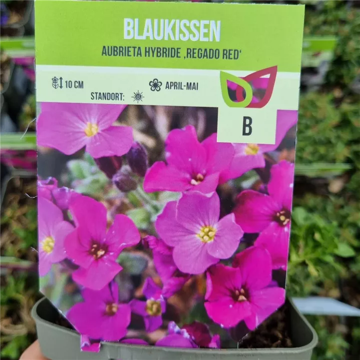 Das Garten-Blaukissen 'Regado Red' (Aubrieta x cultorum) ist eine kissenförmige, polsterbildende immergrüne Staude, die von April bis Mai purpurrote, radförmige Blüten bildet. An einem sonnigen bis halbschattigen Standort mit humosem, nährstoffreichem Boden erreicht es gewöhnlich eine Höhe von ca. 15 cm und wird ca. 30 cm breit. Das Garten-Blaukissen 'Regado Red' ist an geschützten Standorten gut frostverträglich.