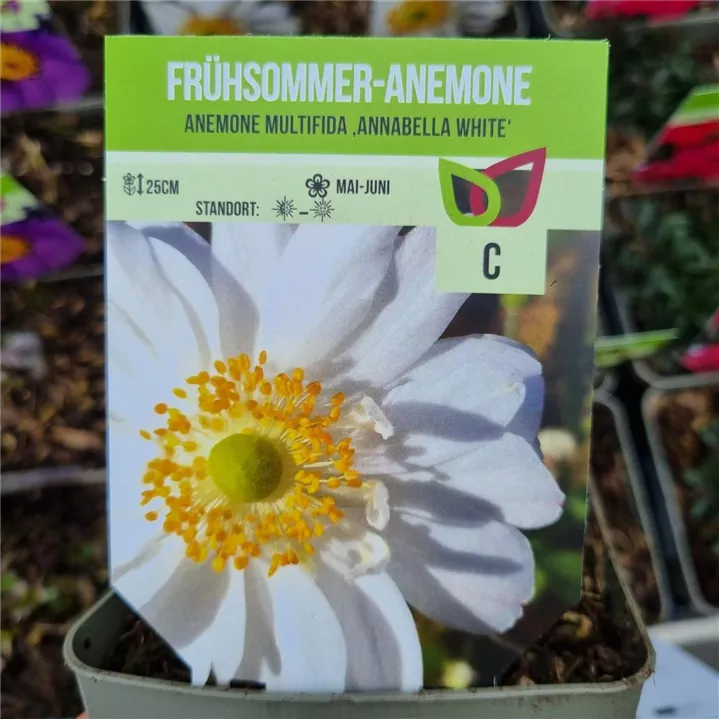 Das Frühsommer-Garten-Windröschen 'Annabelle White' (Anemone multifida) bringt ansehnliche, weiße Blüten von Mai bis Juni hervor. Bevorzugt wird ein durchlässiger, humoser Boden in sonniger Lage. Die rhizombildende, buschige Staude erreicht gewöhnlich eine Höhe von 25 - 30 cm und wird bis zu 30 cm breit.