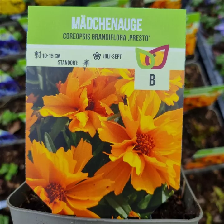 Das Großblumige Mädchenauge 'Presto' (Coreopsis grandiflora) ist eine buschige, horstbildende, kompakte Staude, die von Juni bis August goldgelbe, körbchenartige Blüten bildet. An einem sonnigen Standort mit durchlässigem, nährstoffreichem, sandigem, lehmigem Boden erreicht es gewöhnlich eine Höhe von ca. 50 cm und wird ca. 40 cm breit. Das Großblumige Mädchenauge 'Presto' ist an geschützten Standorten gut frostverträglich.