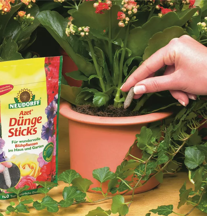 DüngeSticks in Topfrandnähe eindrücken und mit Erde leicht zudecken. Danach die Pflanzen gut angießen und stets ausreichend feucht halten.