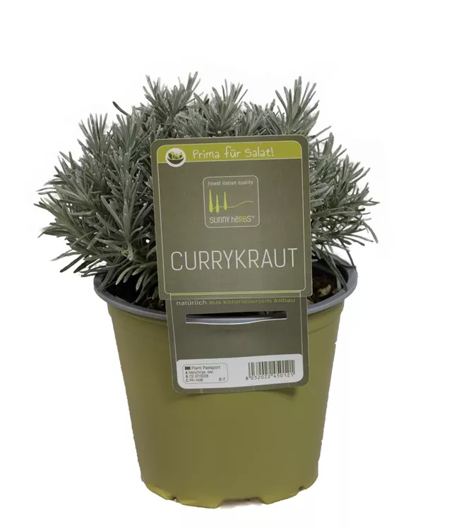 Zum Verzehr geeignet. Die wintergrünen Blätter des Currykrauts sind silbergrau, lanzettlich. Sie verströmen einen angenehmen Duft.