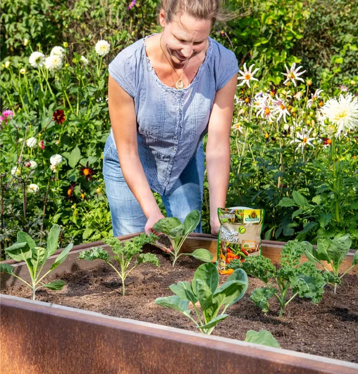 25-150 g/m² ausstreuen und mit einer Harke 5-10 cm tief in den Boden einarbeiten.
