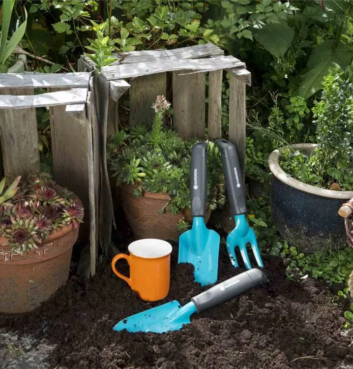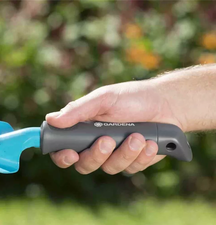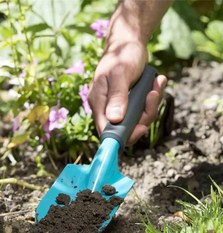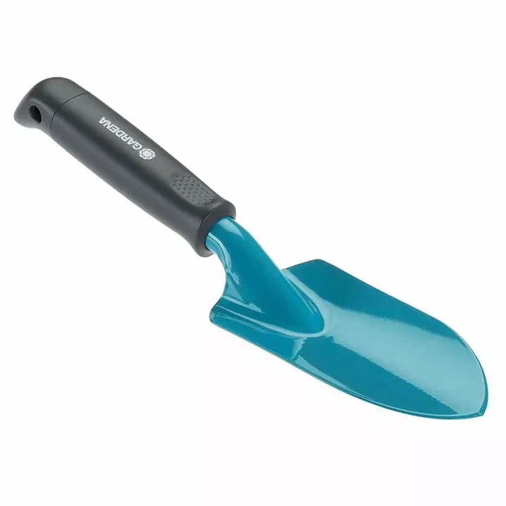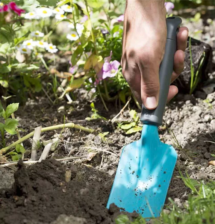 Blumenkelle, aus Stahl in blau und anthrazit, Blattmaß: B 80 mm, gerade, Griffmaterial: Kunststoff