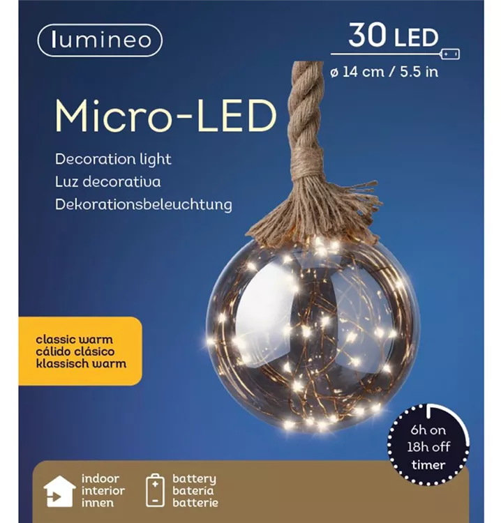In der LED Echtglaskugel befinden sich 30 klassisch warme LED’s. Befestigt ist sie an einem 0,8 m langem Seil. Die Kugel lässt garantiert jeden Raum erstrahlen und sorgt v.a zur Weihnachtszeit für ein stimmungsvolles Ambiente.