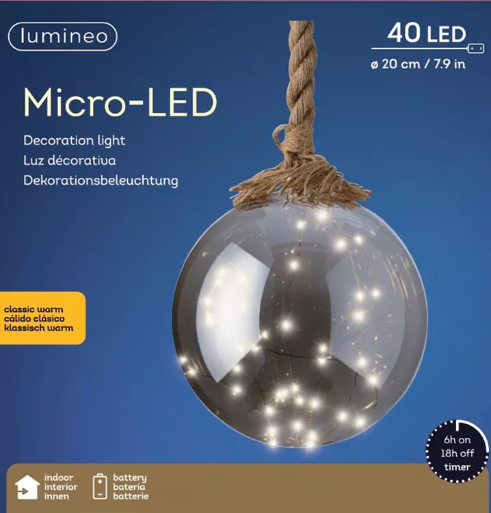 In der LED Echtglaskugel befinden sich 40 klassisch warme LED’s. Befestigt ist sie an einem 0,8 m langem Seil. Die Kugel lässt garantiert jeden Raum erstrahlen und sorgt v.a zur Weihnachtszeit für ein stimmungsvolles Ambiente.