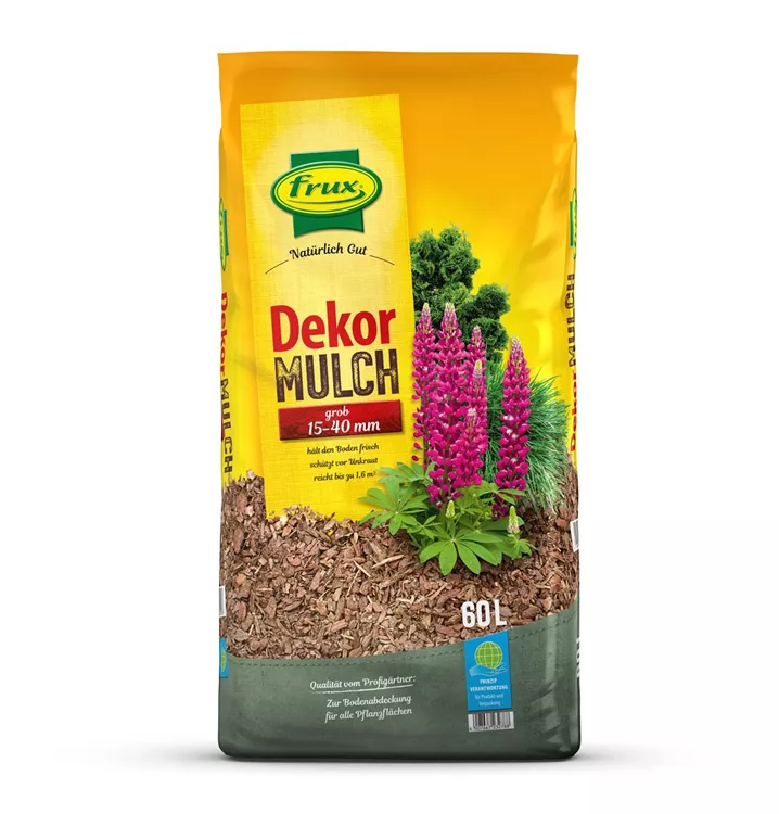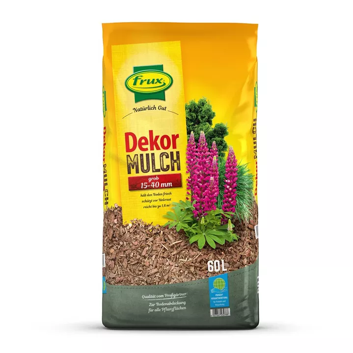 frux Rindenmulch ist ein natürliches Produkt, das zur Dekoration und zur Bodenverbesserung verwendet werden kann. Durch seine Farbe und seine Struktur hebt sich frux Rindenmulch deutlich vom Grün der Blätter und den Blütenfarben ab und bringt diese dadurch stärker zur Geltung. Er bildet einen reizvollen Kontrast zu Rasenflächen und Grünanlagen. Der Ziereffekt von frux Rindenmulch wird zusätzlich noch durch den angenehmen Duft unterstrichen. frux Rindenmulch wirkt isolierend und schützt den Boden. Er verhindert das Auflaufen von Unkräutern und schützt den Boden vor Frost und Hitze. Er vermindert die Wasserverdunstung aus dem Boden, wodurch der Boden frisch und feucht gehalten wird. Die Bodenstruktur bleibt erhalten und Verschlämmungen durch starke Regenfälle werden vermieden. Beim Abbau von frux Rindenmulch wird der Boden zusätzlich mit organischem Material angereichert.