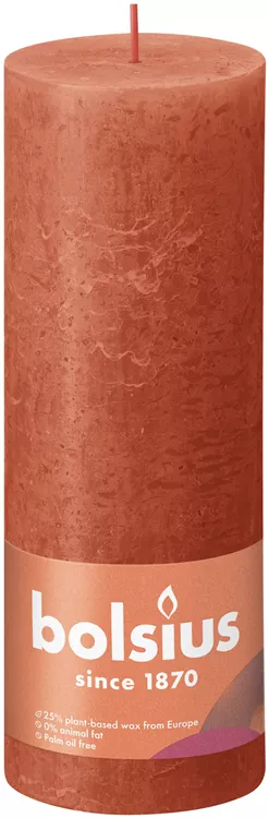 Die Bolsius Rustik Stumpenkerze ist aus 25% pflanzlichem Wachs hergestellt, das in Europa gewonnen wird. Diese nachhaltige Zusammensetzung garantiert eine umweltfreundliche Kerzenoption, da sie frei von tierischen Fetten und Palmöl ist. Dies spiegelt das Engagement von Bolsius für Qualität und Umweltschutz wider, ohne dabei Kompromisse bei der Leistung einzugehen.