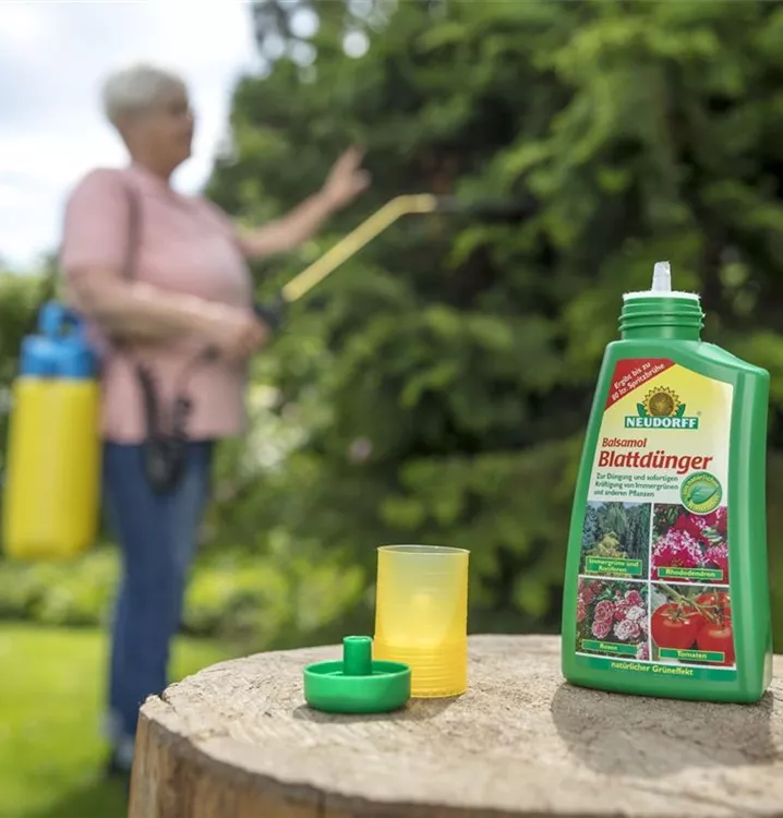 Immergrüne und Koniferen:Balsamol Blattdünger mehrmals 0,3-1 %ig, d.h. 15-50 ml auf 5 Liter Wasser, spritzen. Kann ganzjährig gespritzt oder auch gegossen werden. Besonders bewährt hat sich die Anwendung im Frühjahr (März-Mai) an den ersten warmen Tagen bei Vegetationsbeginn. Bei stark geschädigten Bäumen weitere Behandlungen im Abstand von ca. 6-8 Wochen vornehmen. Je nach Zustand der Pflanzen 0,3-1 %ig spritzen, d.h. 15-50 ml Balsamol Blattdünger in 5 Liter Wasser.