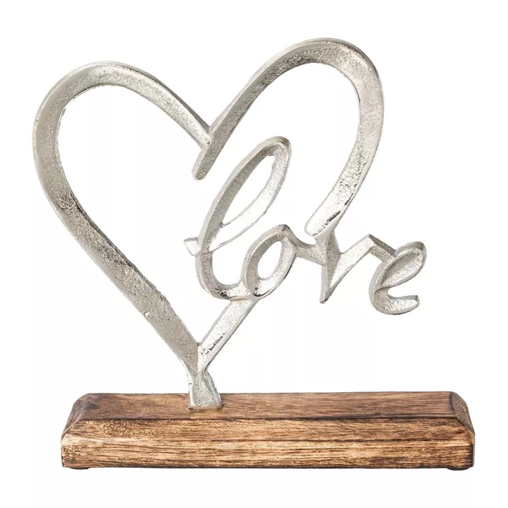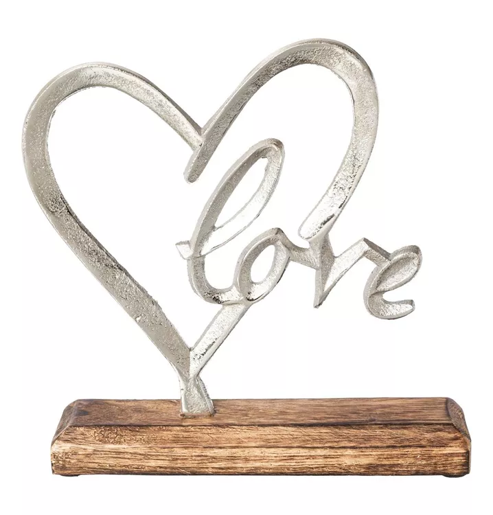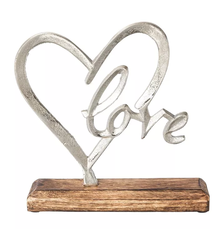 Ein Herz aus Aluminium mit dem Schriftzug "love" auf einen Holzsockel.