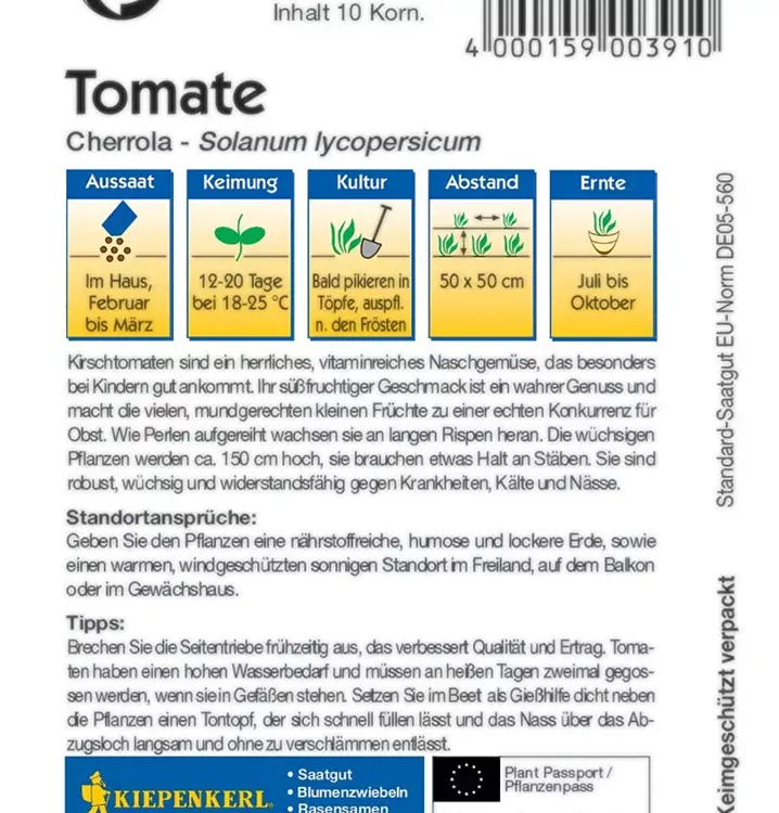 Kirschtomaten sind ein herrliches, vitaminreiches Naschgemüse, das besonders bei Kindern gut ankommt. Ihr süßfruchtiger Geschmack ist ein wahrer Genuss und macht die vielen mundgerechten kleinen Früchte zu einer echten Konkurrenz für Obst. Wie Perlen aufgereiht wachsen sie an langen Rispen heran. Die Pflanzen werden ca. 150 cm hoch, sie brauchen etwas Halt an Stäben. Sie sind robust, wüchsig und widerstandsfähig gegen Krankheiten, Kälte und Nässe.<br>