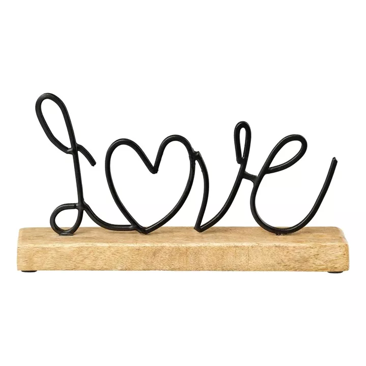 Ein Schriftzug "love" auf einen Holzsockel.