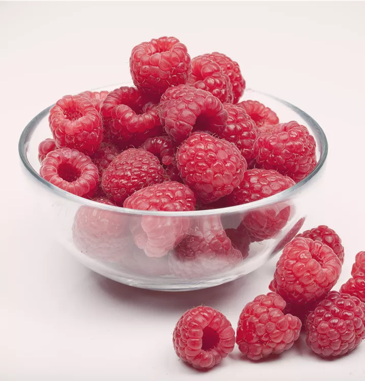 Die Himbeere 'Aroma-Queen'(s) (Rubus idaeus) bildet hellrote, sehr große Beeren. Diese sind weich und aromatisch, süß im Geschmack. Für eine ertragreiche Ernte ab August schaffen durchlässiger, nährstoffreicher Boden und ein sonniger bis halbschattiger Standort optimale Bedingungen. Ihre weißen Blüten sind eine schöne Erscheinung.