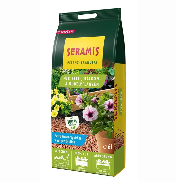 Das SERAMIS® Pflanz-Granulat für Beet-, Balkon- und Kübelpflanzen eignet sich hervorragend zum Mischen mit allen Blumenerden und verbessert diese aufgrund seiner besonderen Eigenschaften deutlich. Je nach Mischungsverhältnis sind die physikalischen Eigenschaften unterschiedlich stark ausgeprägt. Die poröse Beschaffenheit der Tonkörnchen sorgt für eine stabile, aber gleichzeitig lockere Struktur. Das SERAMIS® Pflanz-Granulat speichert viel Wasser und Nährstoffe und sorgt für eine optimale Belüftung der Wurzeln. Es ist für alle Balkon-, Terrassen- und Beetpflanzen, außer Moorbeetpflanzen, geeignet. Für einen einfachen und guten Start mit Ihren Pflanzen ist es bereits für etwa vier Wochen vorgedüngt.