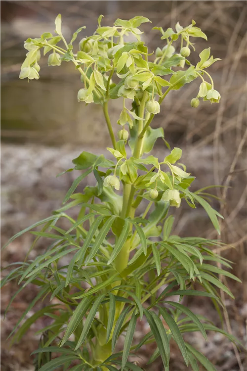 Helleborus foetidus bildet glockenförmige, hellgrüne Blüten ab Februar.