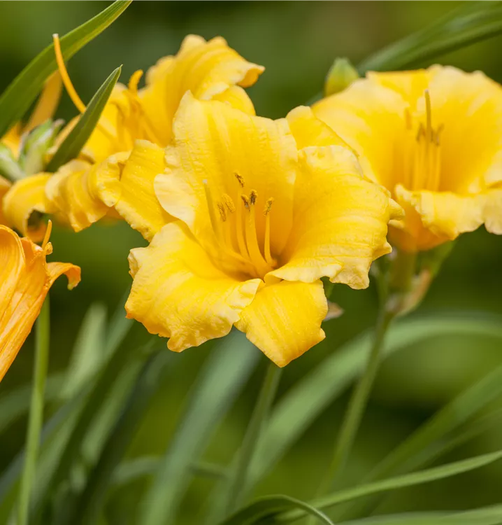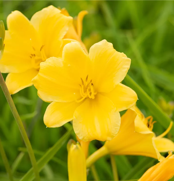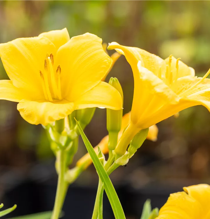 Hemerocallis 'Stella de Oro' bildet trichterförmige, goldgelbe Blüten ab Juni.