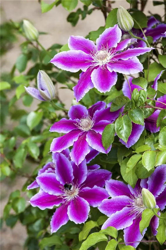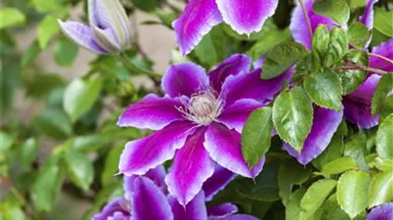 Einen Hang ins Rätselhafte bringt die Farbe Violett mit. Die große Blüte der Clematis ist wie geschaffen für magische Gartenecken. Das aus der gleichen Farbfamilie stammende Pink leuchtet stärker und wirkt ungemein attraktiv, wie man bei Malven gut sehen kann. Effektvolle, harmonische und unübersehbare Kombinationen ergeben sich mit zartem Gelb und Orange. Lila ist anpassungsfähig und in viele Arrangements integrierbar. Ein Beispiel ist der kugelige Zierlauch.