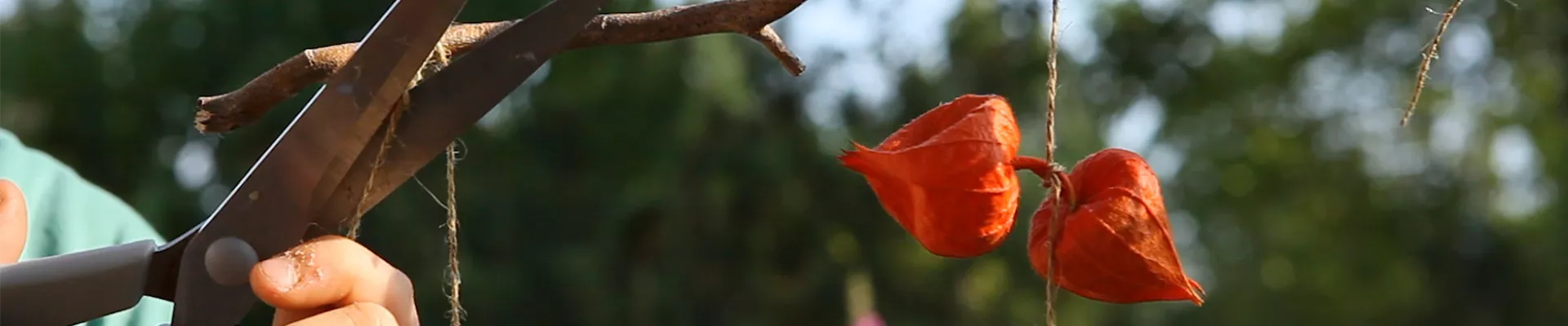Ein herbstliches Windspiel aus Tannenzapfen und Physalis sorgt für Musik.