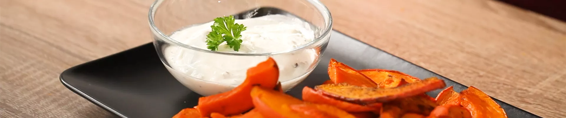 Der perfekte Herbst-Snack für euch: leckere Kürbisspalten mit Dip.